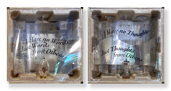 Assemblage sculpture with electronic waste and other recycled materials