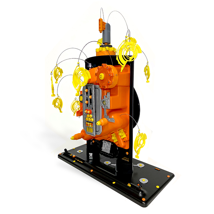 About the process, working with plastics has its own challenges. The black part - the support - is a part of a Bose audio system, the orange mold came inside an IKEA toolbox, the yellow shapes are from Wixela asthma inhaler.